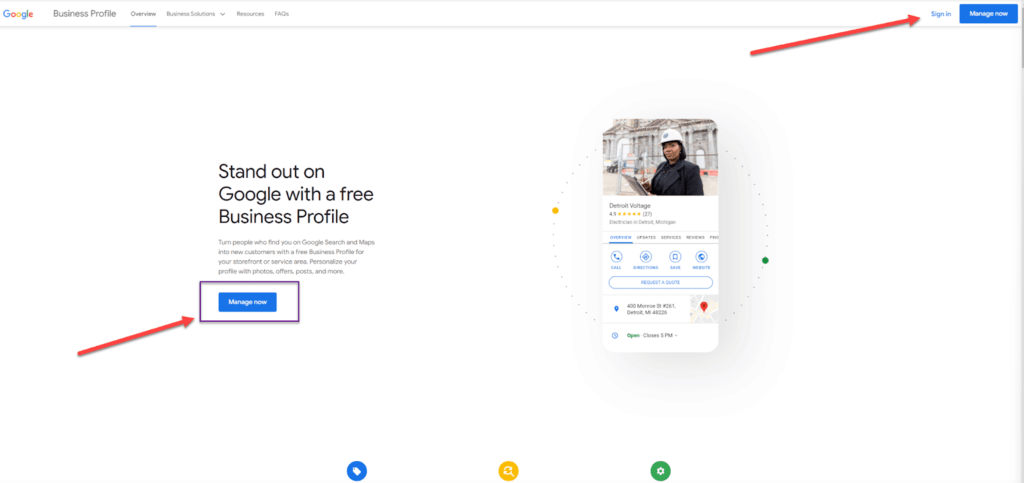 The first way to access the old Google Business Profile dashboard is login into your Google Business Profile at https://www.google.com/business/. Click the sign-in button or manage now button.