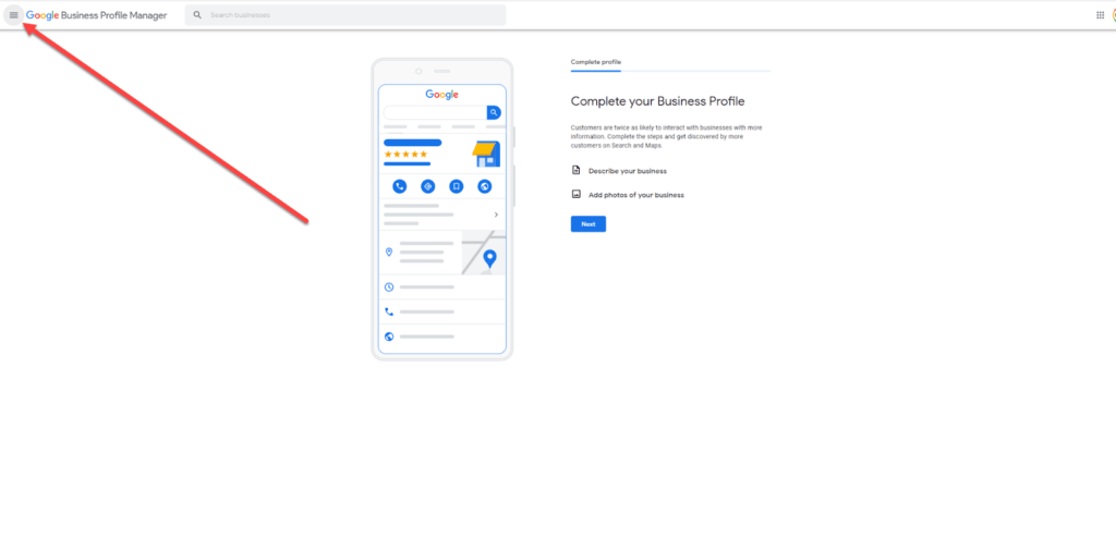 Once you click on it, you will go to a Google Business Profile manager page. All you have to do now to access the old dashboard is click the hamburger menu in the top left hand corner and the old dashboard menu will appear.