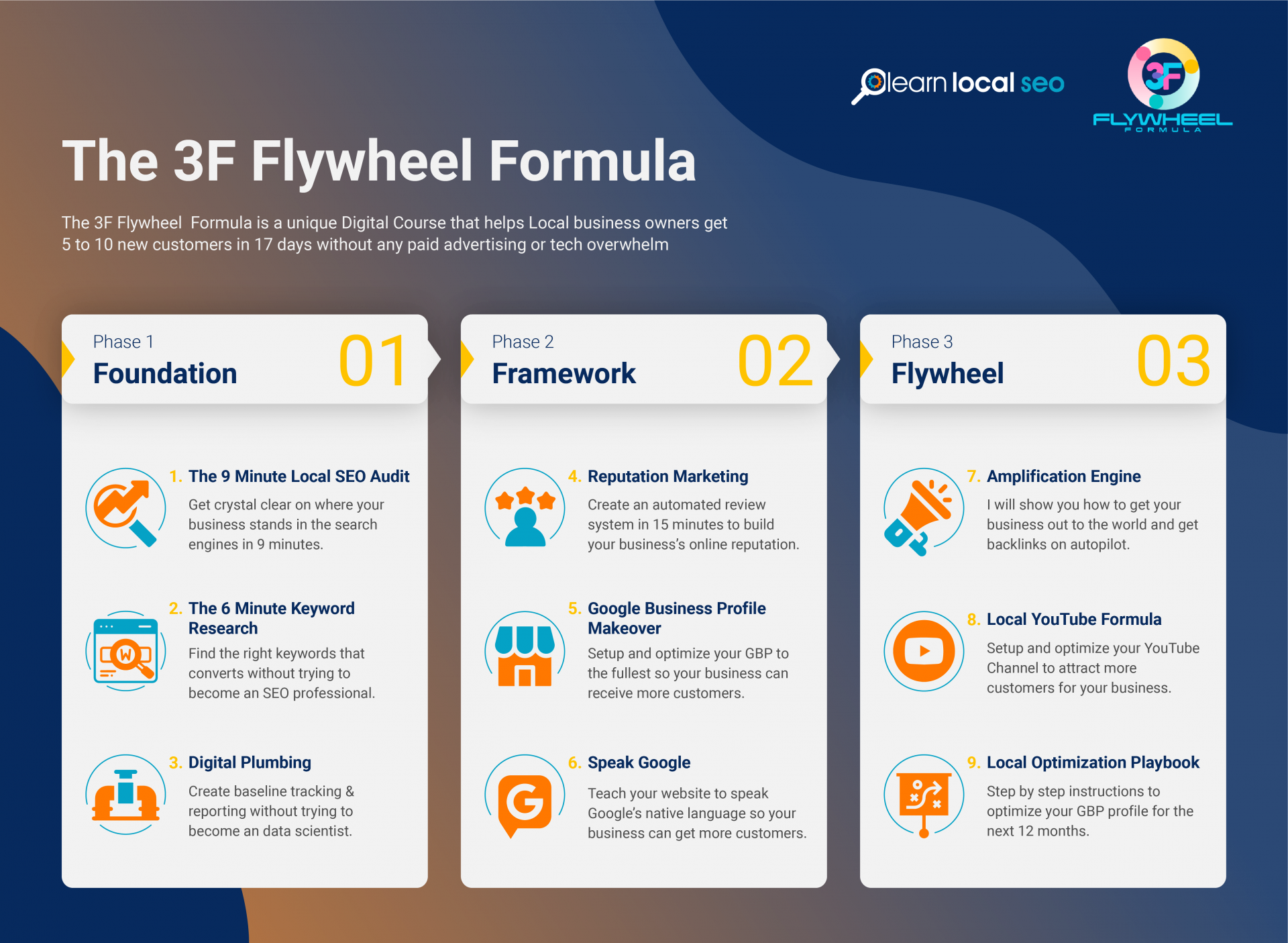 The 9 Step by Step system we use to help local businesses get more customers consistently from Google like clock work. Includes New PDF Download and Masterclass Video.